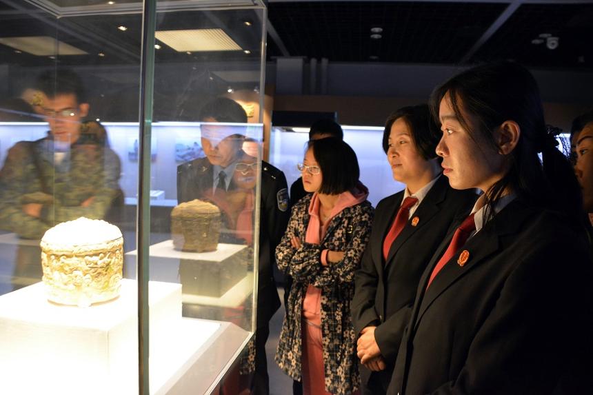 在博物馆展厅内,干警们参观了《包头历史文物陈列》、《燕家梁元代遗址考古成果展》、《藏传佛教唐卡艺术陈列》、《史话石说——内蒙古古代岩画陈列》,大家认真聆听讲解员的讲解,通过一件件文物、一幅幅岩画,进一步了解包头这片神奇土地上波澜壮阔的历史轨迹,仿佛置身于广袤的草原、巍峨的青山之中,在这里不仅体味到包头昨天的魅力,更获得鉴古惜今的认知。